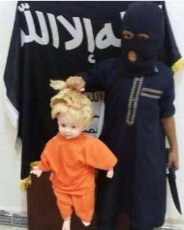 IŞİD bayrağı önünde duran bir çocuk, elinde bıçak oyuncak bir bebeğin kafasını keserken görülüyor.