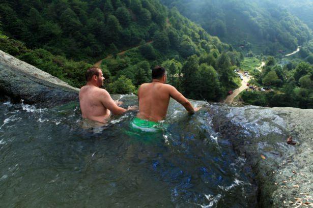 Dik ve tehlikeli alanlarda bulunan havuzlarda yüzen vatandaşlar bir yandan manzaranın keyfini çıkarıyor, bir yandan da serinliyorlar