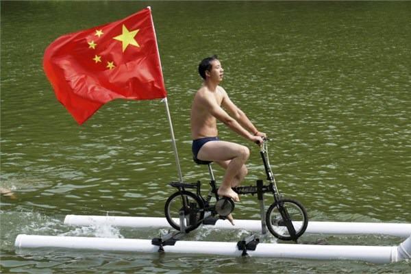 Çin Liu Wanyong, iki boru üzerine yerleştirilen bu bisikletle deniz üzerinde bisiklet sürme keyfi yaşatıyor.
