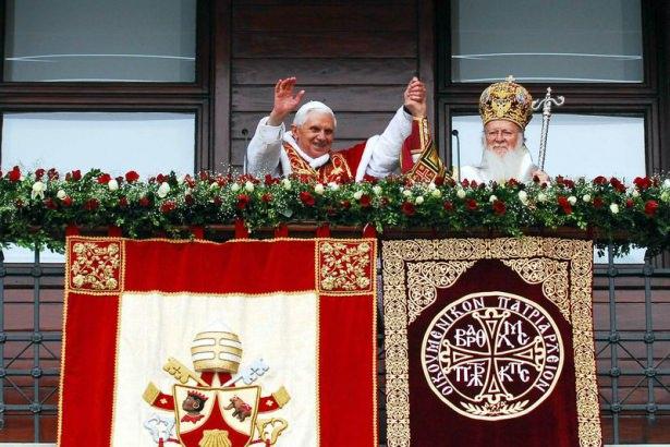 Papa 16. Benediktus (solda) Türkiye ziyaretinde Fener Rum Patriği Bartholomeos ile birlikte balkondan el ele tutuşarak halkı selamladı.