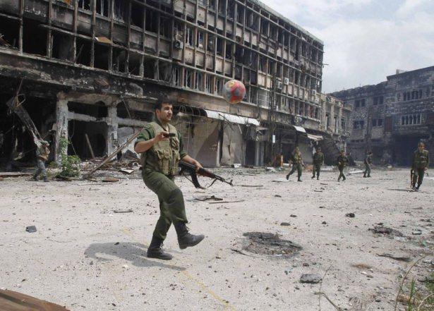 Suriyeli askerler Humus'ta bir mahellede top oynuyor.