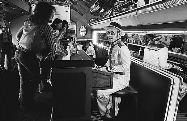 Elton John, kendi özel uçağında piyano çalarken, 1976.