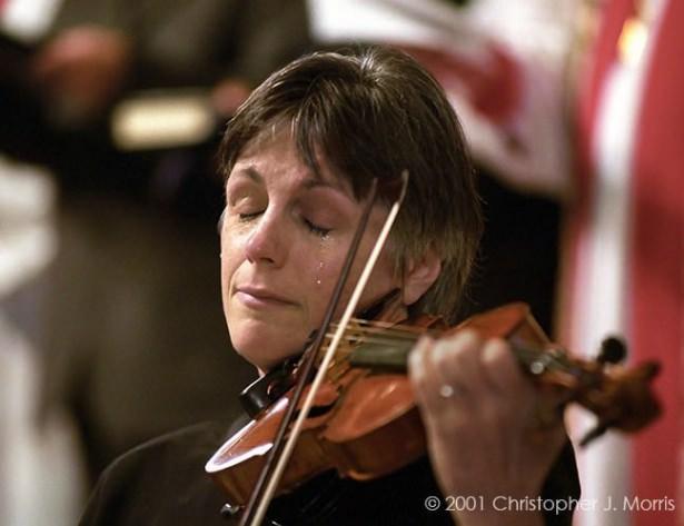 Kemancı Nancy Dinovo, 11 Eylül kurbanları için Vancouver’da düzenlenen anma sırasında keman çalarken gözyaşlarına hakim olamıyor.
