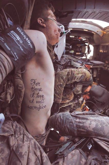 “Sevdiklerim için kendimi feda edeceğim.” Yaralı askere müdahale edilirken, vücuduna dövme olarak işlettiği bu sözler dikkat çekiyor.