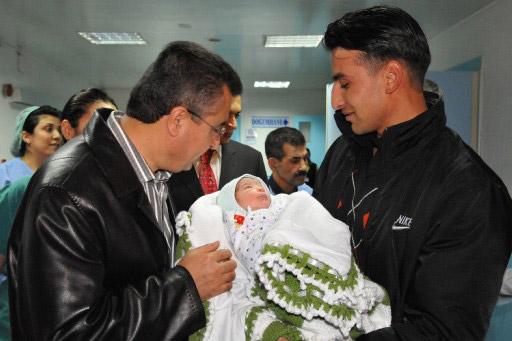 HATAY'DA YENI YILIN ILK BEBEGI ANTAKYA DOGUMEVI HASTANESI'NDE DUNYAYA GELDI. HATAY VALISI MEHMET CELALETTIN LEKESIZ (SOLDA) VE ESI ZEHRA LEKESIZ DE YENI YILIN ILK BEBEGINI ZIYARET EDEREK ALTIN HEDIYE ETTI.