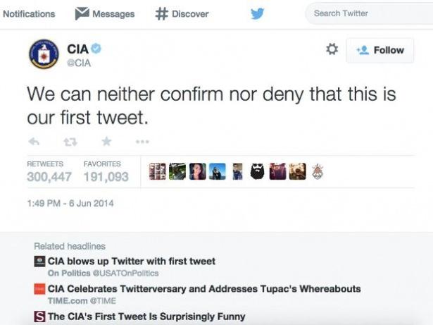 CIA Twitter’a girdi ve ilk tweet’iyle gündem oldu. ‘Bunun ilk tweet’imiz olduğunu ne inkâr ne de teyit edebiliriz.’ Bu tweet anında 300 binden fazla RT aldı.