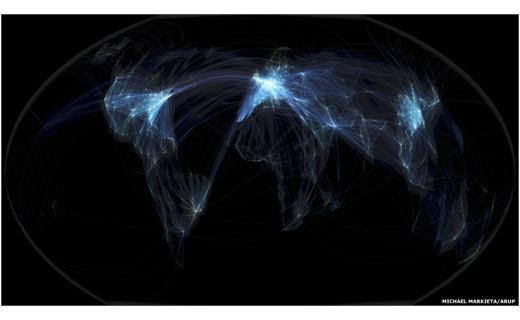 Küresel mühendislik ve tasarım firması Arup'ta ulaştırma planlaması yapan Michael Markieta, yerküreyi boydan boya kateden uçuş hatlarının görsel grafiklerini çıkarttı.