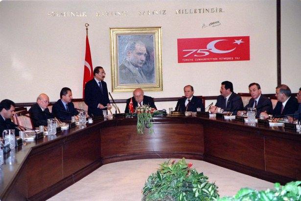 Bakanlar Kurulu 9. Cumhurbaşkanı Süleyman Demirel başkanlığında 12 Mayıs 2000'de toplandı. Toplantıda Başbakan Bülent Ecevit (sol 4) ve Devlet Bakanı ve Başbakan Yardımcısı Devlet Bahçeli (sağ 4) de katıldı.