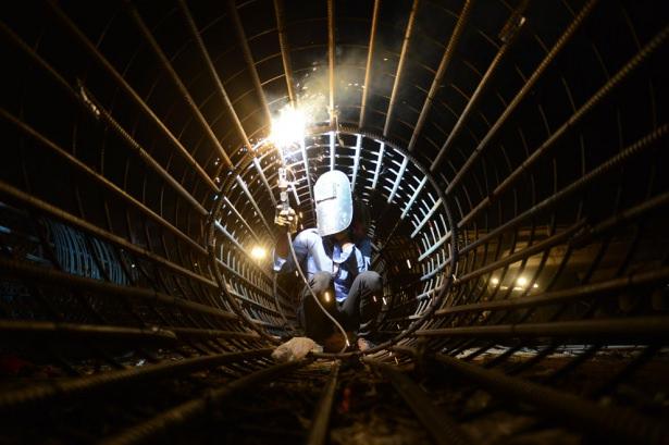 20 yaşındaki Nepalli işçi Raju Tamang, Katmandu'daki bir köprünün genişletilme projesinde çalışırken.