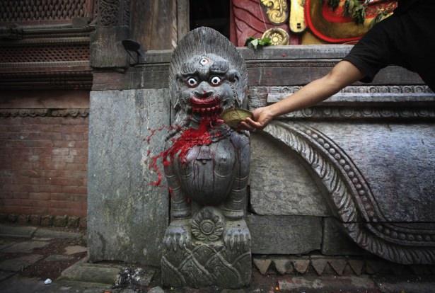 Indra Jatra festivalinda mandasını kurban eden bir dindar, mandanın kanını aslansı bir tanrı putuna adak adıyor.