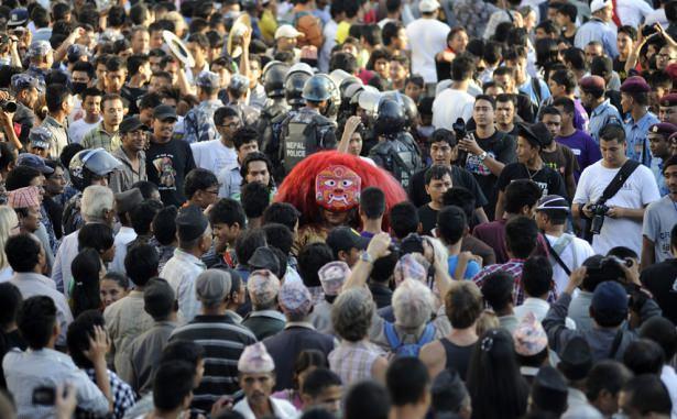 Tanrıça Kumari maskeleri takmış bir grup Nepalli dansçı, Katmandu'daki Durbar Meydanı'nda performanslarını sergiliyorlar.
