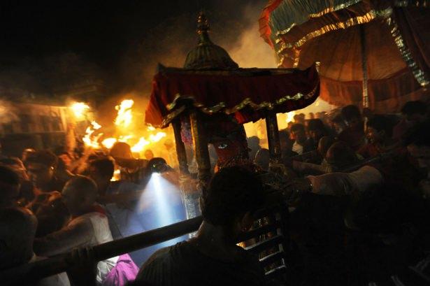 Nepalli rahipler, Bhoto Jatra festivalinin son gününde, Nepal'in başlıca tanrısı olan Kırmızı Machindranath'ın bir putunu taşıyorlar. Bu ayinin bol yağış, bol hasat ve bereket için yapıldığını söylüyorlar