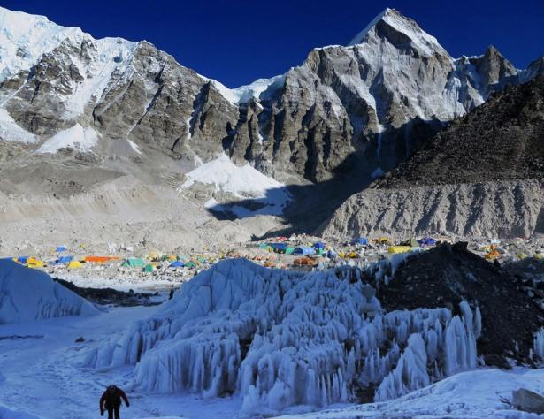 Crampon noktasından Everest kampı. Burası Everest Dağı'nın hemen altındaki Khumbu buz çağlayanına giriş noktası. Burada oluşan bir çığ, 18 Nisan 2014'te 16 Nepalli şerpanın ölümüne neden olmuştu.