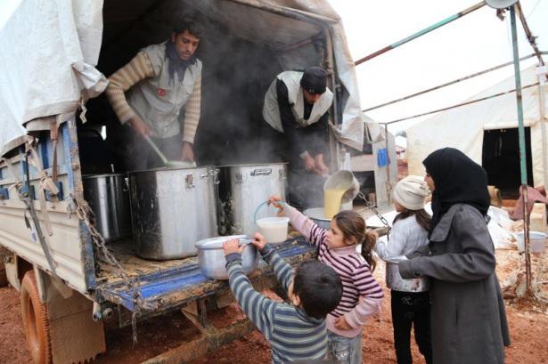 İnsan Hak ve Hürriyetleri (İHH) İnsani Yardım Vakfı, ülkelerindeki çatışmalardan kaçarak, güvenli olduğunu düşündükleri Türkiye sınırına yakın bölgelerde kurdukları derme çatma çadırlarda yaşam mücadelesi veren 120 bin Suriyeliye sıcak yemek dağıtıyor.
