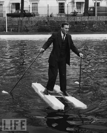 1962 - M.W.Hulton, üzerinde zor durduğu pervaneli deniz ayakkabısını İngiltere’deki Grand Union Kanalı’nda denemeye çalışırken görülüyor.