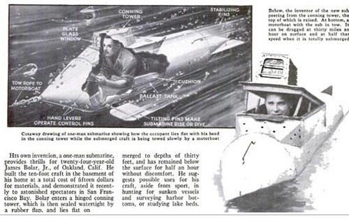 Haziran 1933 24 yaşındaki James Bolar Jr., tek kişilik bu denizaltıyı evinin bodrumunda inşa etti. San Fransisco körfezinde dalış gösterisi yapan 2.5 metre boyundaki denizaltı 9 metre derinliğe inebiliyor, yarım saat su altında kalabiliyordu.