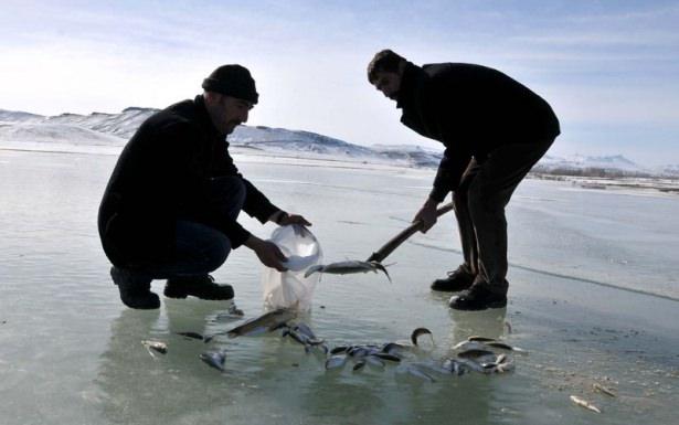Baraj gölüne gelenler, yaklaşık 20 santimetre kalınlığındaki buz tabakasını baltayla kırdıktan sonra içerisine koydukları kafeslerle balık tutuyor.