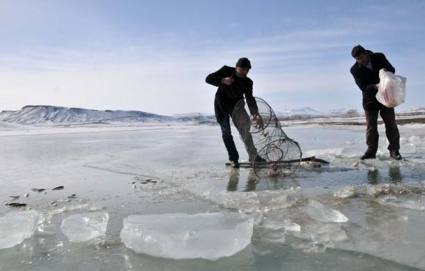 Yüzeyi buzla kaplanan gölde balık avlamanın keyfini çıkaran vatandaşlar, buzlu zeminde semaverde demledikleri çayı içerek hoşça vakit geçiriyor.