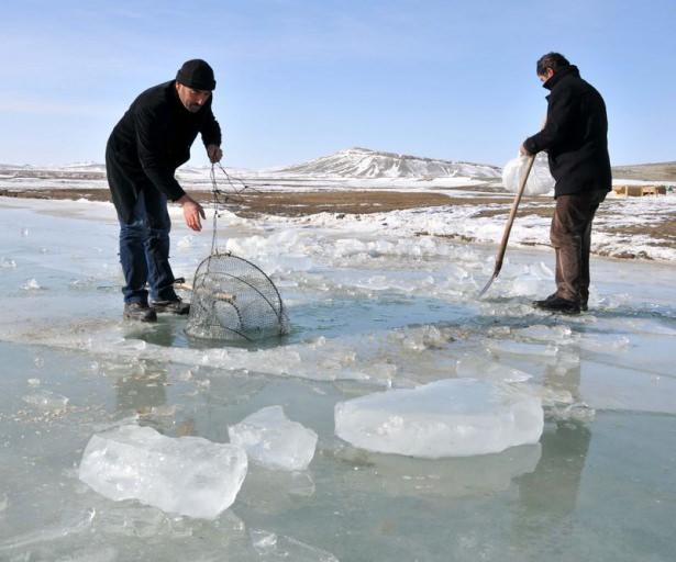 Barajın soğuk hava nedeniyle buz tuttuğunu dile getiren Ece, "İlk önce buzları kırıyoruz. Kafeslerimize bayat ekmekleri koyuyoruz. Bir gün bekliyoruz. Üzeri yeniden buz tutmuş oluyor. O buzu kırıp kafesi çıkarıyoruz. Nasipte ne varsa o çıkıyor" dedi.