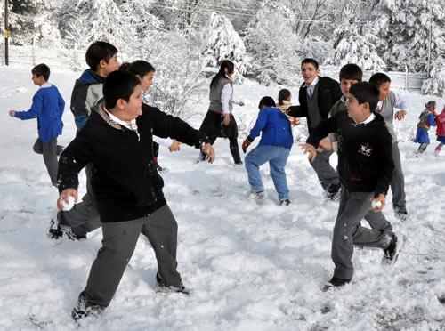 BOLU'DA KAR YAĞIŞI SEBEBİYLE HER YER BEYAZA BÜRÜNÜRKEN ÖĞRENCİLER VE ÖĞRETMENLER KARTOPU OYNAYARAK KARIN ZEVKİNİ ÇIKARDI. (BÜLENT VELİOĞLU/BOLU-İHA)