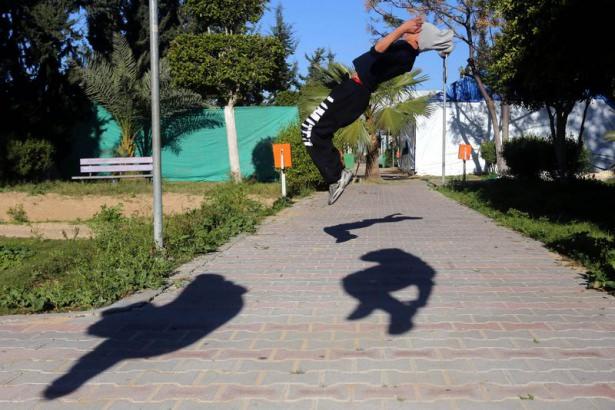 Gazze'deki Filistinli gençler, insan vücudunun yeteneklerini verimli şekilde kullanıp, bir noktadan başka bir noktaya hızlı ve etkili biçimde hareket etmesini hedefleyen bir beden eğitimi olan Parkur sporunda hünerlerini sergiliyor.