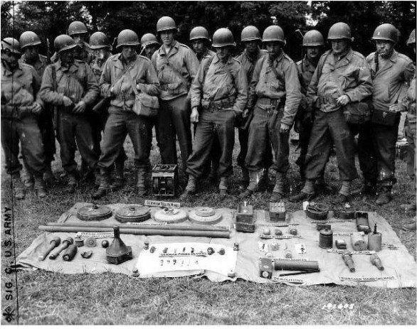 Amerikan askerleri Alman askerlerinden ele geçirdikleri mayınlar, bombalar ve diğer patlayıcılarla poz veriyorlar.
