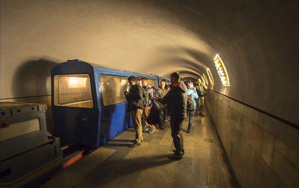 3 milyon metreküp iç hacmi olduğu belirtilen Novy Afon mağarasına girmek için bir süre yeraltında raylı sistemle gidiliyor.