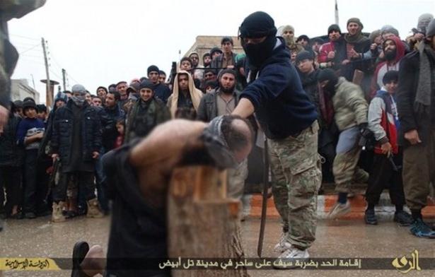 IŞİD, büyücü olduğu söylenen bir kişinin herkesin gözü önünde kafasını kesti...
