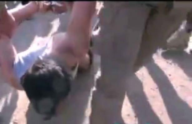 Korkunç görüntüde IŞİD mensubu teröristler, Suriyeli bir askerin kafasını kesmeden önce darp edip onunla dalga geçiyor.