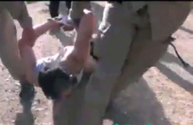 Askerin yalvarmasına aldırmadan vahşice boğazını kesen teröristler, askerin kafasını kestikten sonra bedeninin üstüne koyuyor.