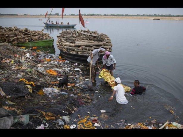 Her ölü beden yakılmadan önce Ganj'da yıkanıyor.