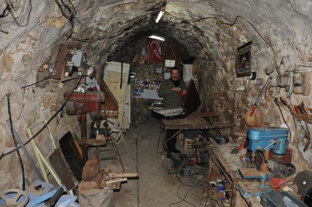 Mardin'de sıcak demir ustalığı yapan mahalli sanatçı Abdulkadir Gökbalık (56), iş yerinde hem demir dövüyor hem de kanun çalıyor.