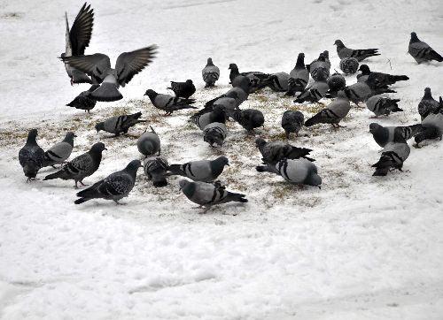 Gümüşhane'de kar yağışının ardından yem bulmakta sıkıntı yaşayan güvercinlerin yardımına her yıl olduğu gibi vatandaşlar yetişti. Zafer Meydanı'nda işyerleri bulunan esnaf ve çevredeki evlerde oturan vatandaşlar aç güvercinleri buğday ve bulgurla doyuruyor. (CİHAN/İbrahim Bayraktar)
