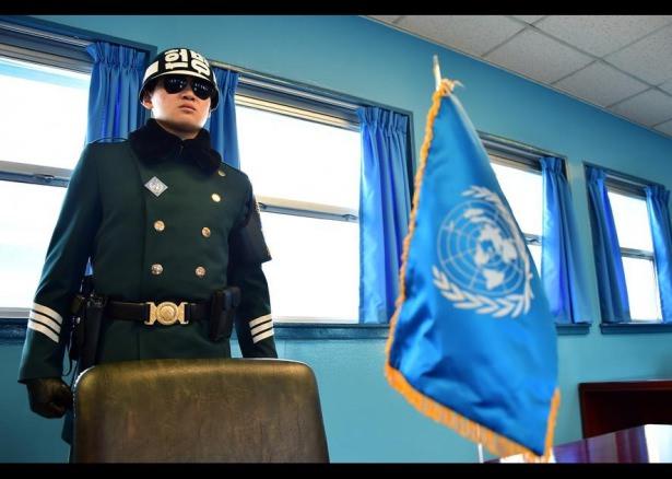Masadaki sınır ihlallerini önlemek için her iki uçta da silahlı iki asker nöbet bekliyor