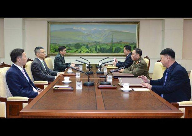 Kuzey ve Güney Koreli yetkililer, söz konusu masanının iki yanına oturarak görüşüyor.