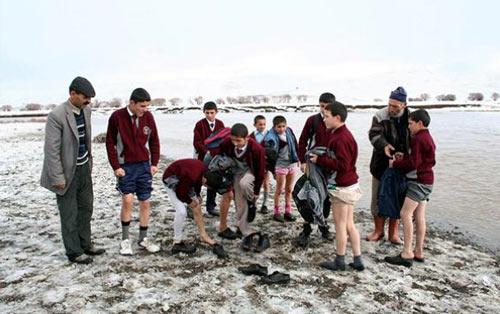 Okula giden yol buz gibi nehirden geçiyor