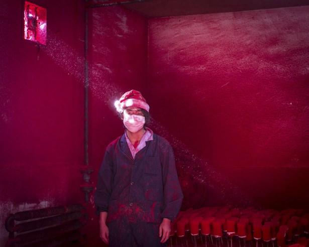 Yiwu kentindeki bir fabrikanın renklendirilmesi için kırmızı toz kullanılırken fabrikanın 19 yaşındaki çalışanı Wei, maske ve Noel Baba şapkası takıyor…
