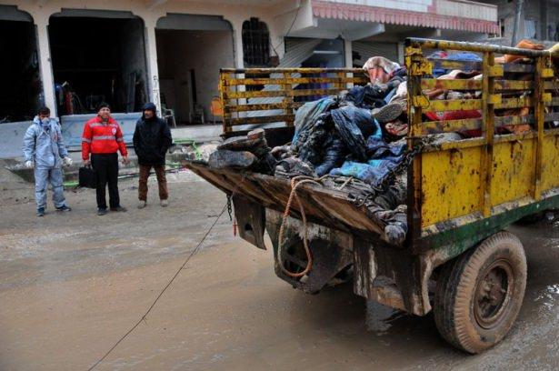 Ölen IŞİD mensuplarının cesetleri, özel kıyafetli ve maskeli kişilerce toplanıyor.
