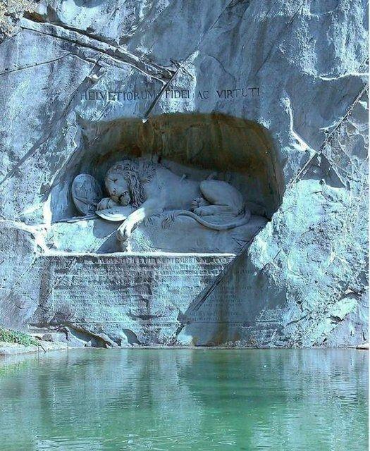 Fransız devrimi sırasında ölen İsviçreli Muhafızlar onuruna yapılan yaralı Aslan Heykeli; Luzern, İsviçre