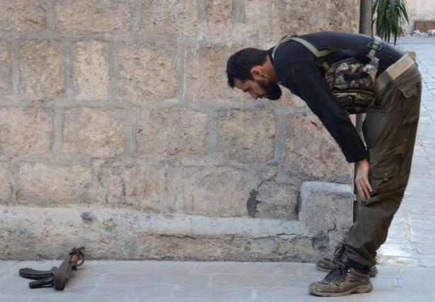 Kalaşnikof silahını sütre yaparak namaz kılan bir savaşçı.