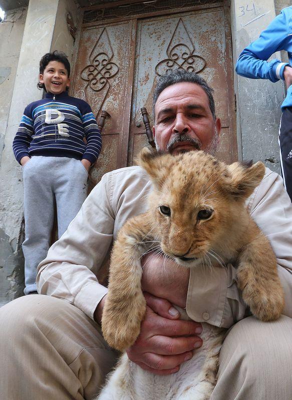 Gazzeli Sadeddin el-Cemel (sağda) (50) yaklaşık 3 ay önce hayvanat bahçesinden satın aldığı aslan yavrularını büyük bir özveriyle evinde beslemeye başladı.