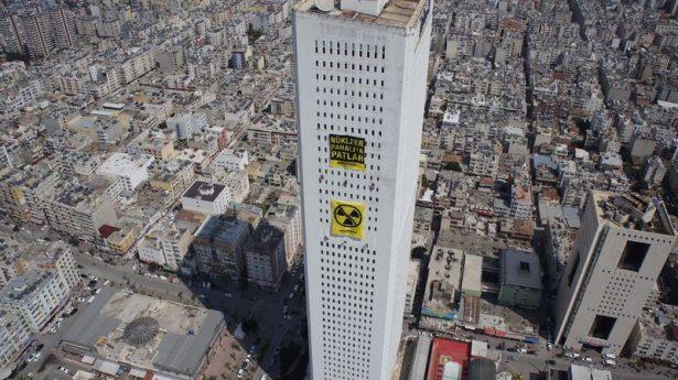 Mersin'de bir grup Greenpeace üyesi, 52 katlı bir otelin pencerelerinden sarkarak açtıkları pankartlarla nükleer santral karşıtı eylem yaptı.