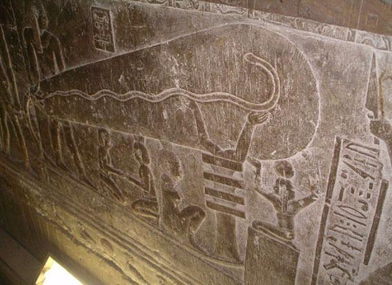 Mısır ,Dendera'daki Hathor tapınağında göze çarpan ampuller. Bu ampuller kıvrımlı kablolar ile bir jeneratöre veya açma kapama düğmesine bağlılar. Ampul şeklindeki cismin içine bir yılan tasviri konmuş. Bu da ampulün içindeki ince teli gösteriyor olabilir.