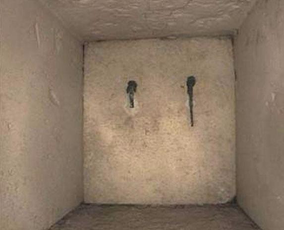 Rudolf Gantenbrink tarafından Büyük Piramit'te keşfedilen bakır kulplu kapı. Resim UPUAUT 2 adlı bir araştırma robotu tarafından çekilmiştir... Hangi amaca hizmet ettiği bilinmeyen gizemli kapı, kraliçe odasından başlayan güney kanallarında yer almaktadır. Bu kapının arkasında başka bir kapı daha bulunmuştur. Yapılan bazı araştırmalar sonucunda içinde ne olduğunu bilmediğimiz bir oda veya odalar bu ikinci kapının arkasında bulunmaktadır. Aynı kapıdan kral odasından başlayan kuzey kanallarında da bulunmuştur. Burada sorulan en önemli soru şu: Görünüşte hiçbir amaca hizmet etmeyen bu kapılar Neden buralara kondu ?