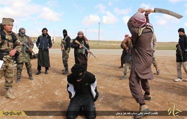IŞİD'ın yayınladığı fotoğraflar, gözü kapalı bir adamın Suriye'nin Hama şehrinde kafasını kestiği görülüyor.