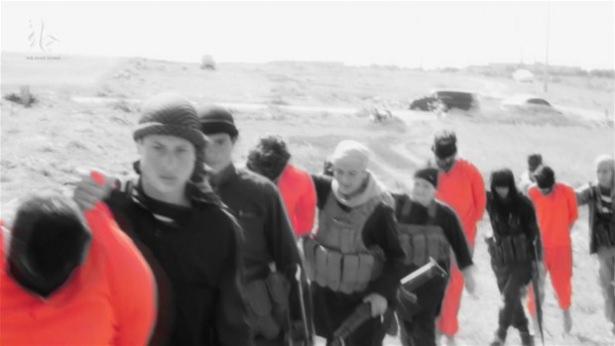 Yayınlanan videonun sonunda, IŞİD teröristleri tarafından 8 çocukla birlikte turuncu kıyafetler giydirilmiş ve gözleri bağlanmış şekilde cinayet mahalline getirilen Şiiler,