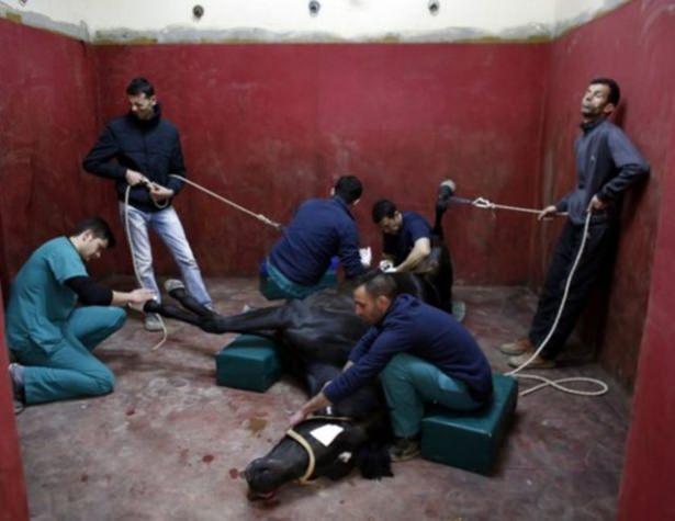 Bayıltılan at, hadım ediliyor.