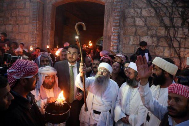 Laleş Dağı'ndaki tapınağa yürüyen Yezidiler, günahlardan arındıklarına inandıkları Enzel Köprüsü'nün kapısını öperek, dualar ettiler ve üç tur attı.