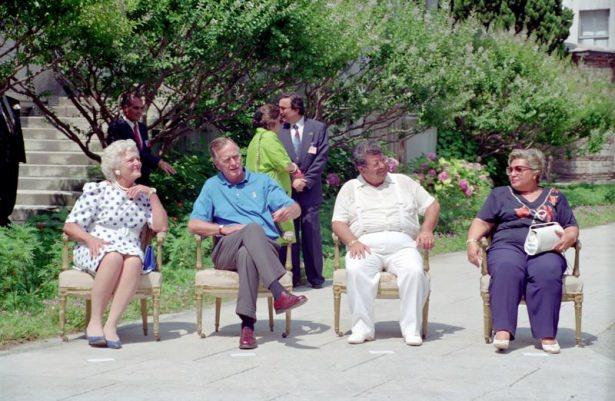ABD Başkanı George Bush ve eşi Barbara Bush (solda) 21 Temmuz 1991'de Topkapı Sarayı'nın bahçesinde Cumhurbaşkanı Özal ve eşi ile birlikte dinlenirlerken...
