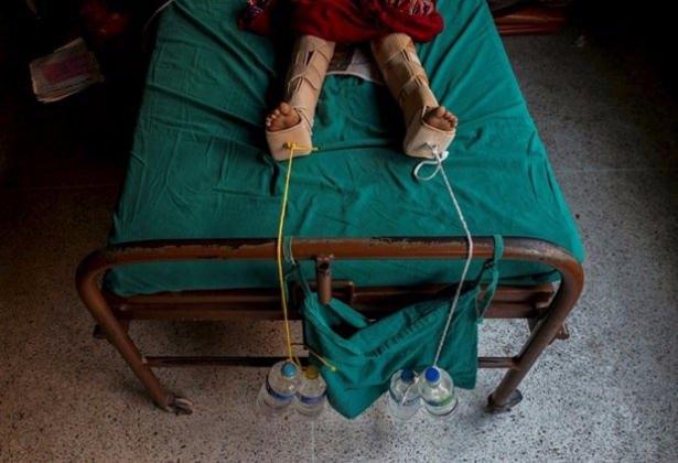 Nepal'deki 7.8 büyüklüğündeki deprem sonrası küçük bir çocuğun iki bacağı da kırıldı. Hastaneye kaldırılan çocuğun ayaklarını sabitlemek için su dolu pet şişeler kullanıldı. Tıbbi malzeme ve ilaç sıkıntısı çeken sağlık görevlileri, yaralıları sağlığına kavuşturmak için bu tür yöntemlere başvurmak zorunda kalıyor.